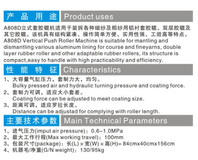 適用于粗、細(xì)紗膠輥、鋁襯膠輥、雙層膠輥的套制和剝離。采用壓縮空氣,杜絕了皮輥油污,清潔節(jié)能.